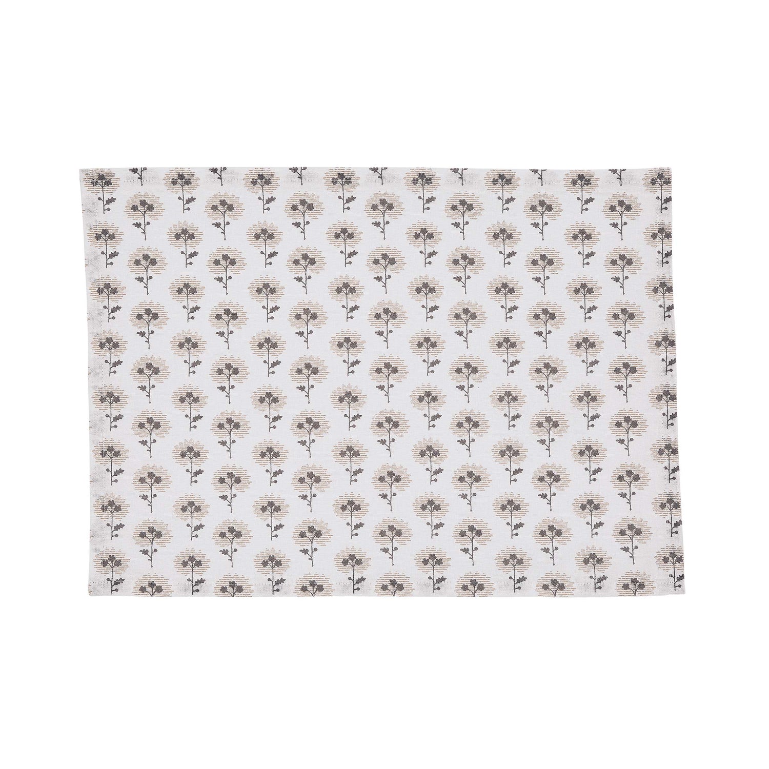 A set of two printed cotton placemats adorned with a repeating oak leaf & floral motif in natural linen & grey tones. Designed to bring a subtle yet elegant pattern to your table setting.