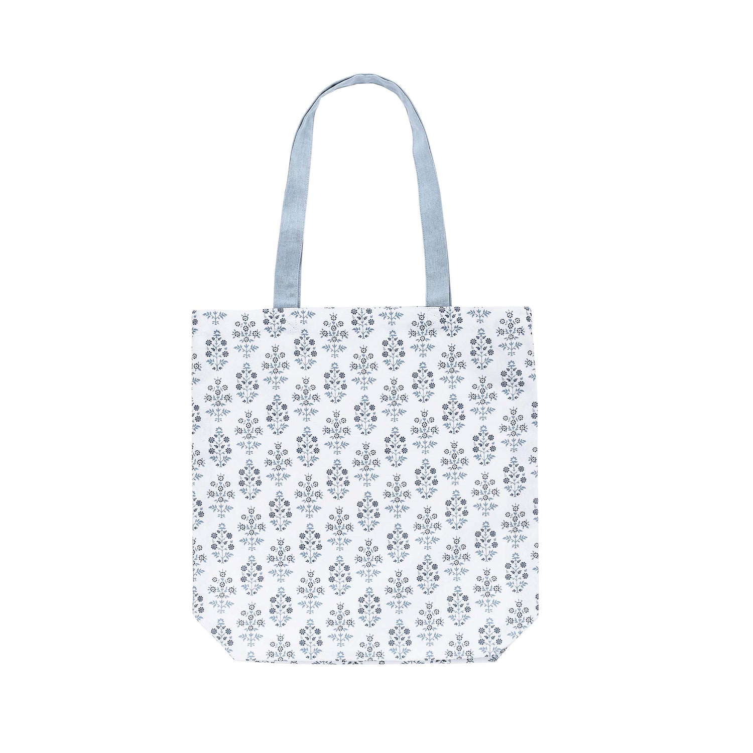 Practical yet stylish, this 100% cotton tote bag is ideal for everyday use. Featuring delicate paisley floral motifs in soft blue tones and complemented by plain blue handles, it’s both functional and effortlessly charming.